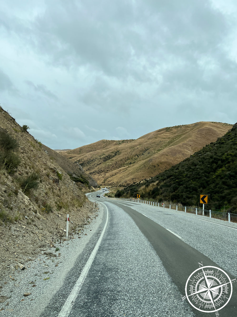 Für uns ging es nun vom „White Horse Hill Campsite“ nach Queenstown und Fahrt dauerte insgesamt etwa 3 ½ Stunden, aber wir haben noch einen Stopp dazwischen gemacht. Wir mussten dafür nochmal durch „Twizel“, wo wir noch tankten und dann ging es weiter auf dem „State Highway 8“ vorbei an „Omarama“ und dann durch den „Lindis Pass“. Hier wird es dann ziemlich kurvenreich, da man mitten durch die Berge fährt, aber auch ziemlich schön.