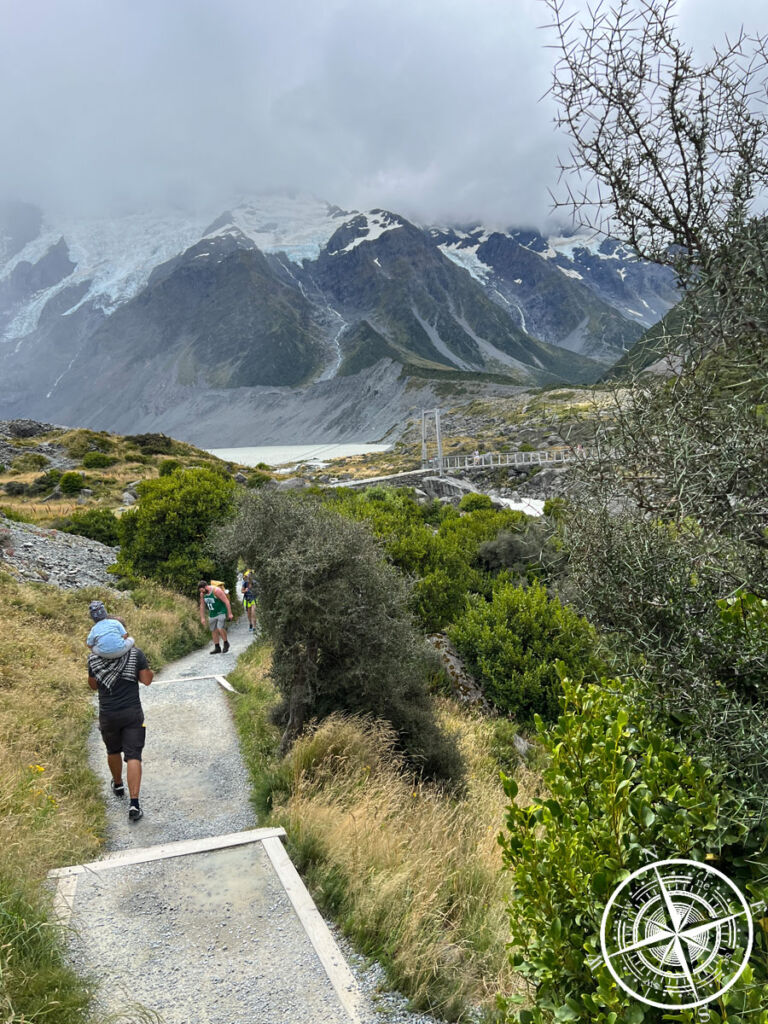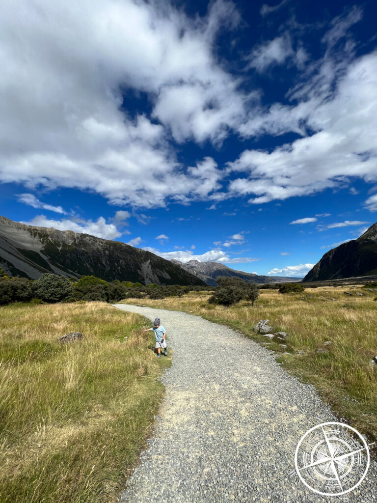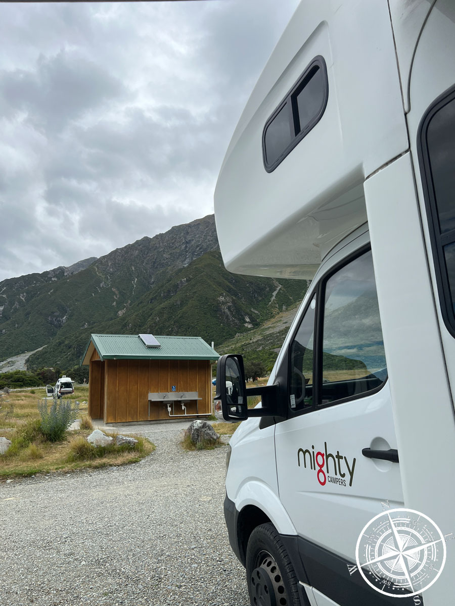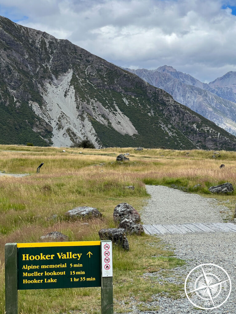 Wir haben uns einen Stellplatz gesucht und da das Wetter doch noch soweit ganz gut aussah, entschieden wir uns für eine kleine Wanderung. Von dem Campingplatz aus gehen direkt verschiedene Wanderungen los. Wir sind ein Stück des „Hooker Valley Track“ gegangen.