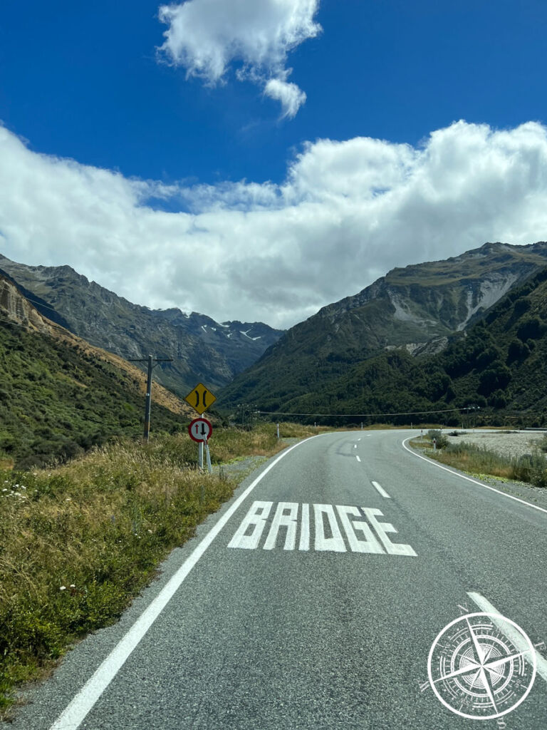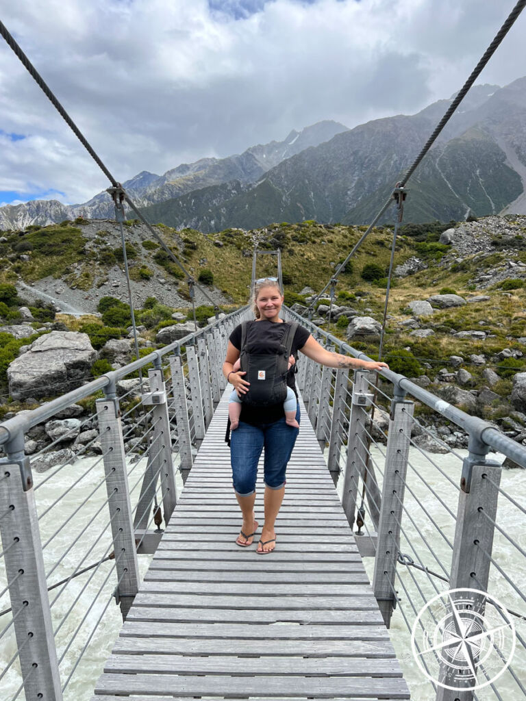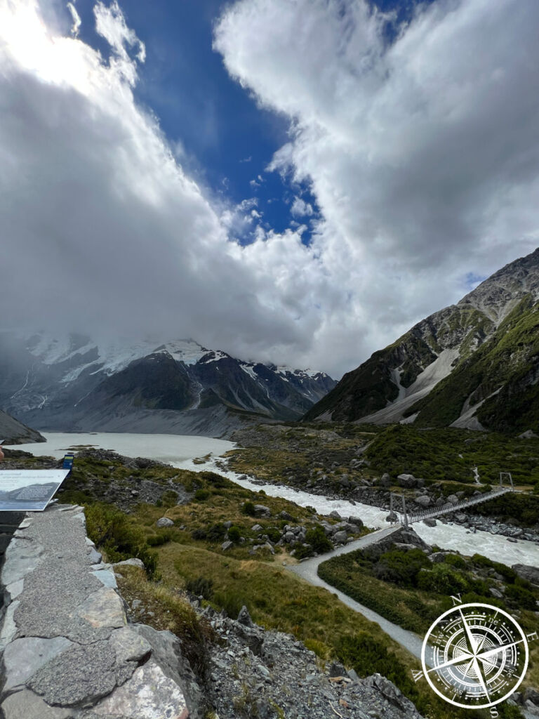 Hier befindet sich dann auch die „1st Swing Bridge“ von 3 auf dem „Hooker Valley Track“. Ganz am Ende hat man dann auch tatsächlich (je nach Wetter) Blick auf den „Mt. Cook“. Wir sind aber nur ein Mal über die erste Brücke und sind dann wieder umgedreht.