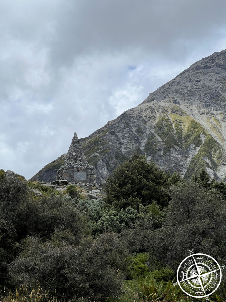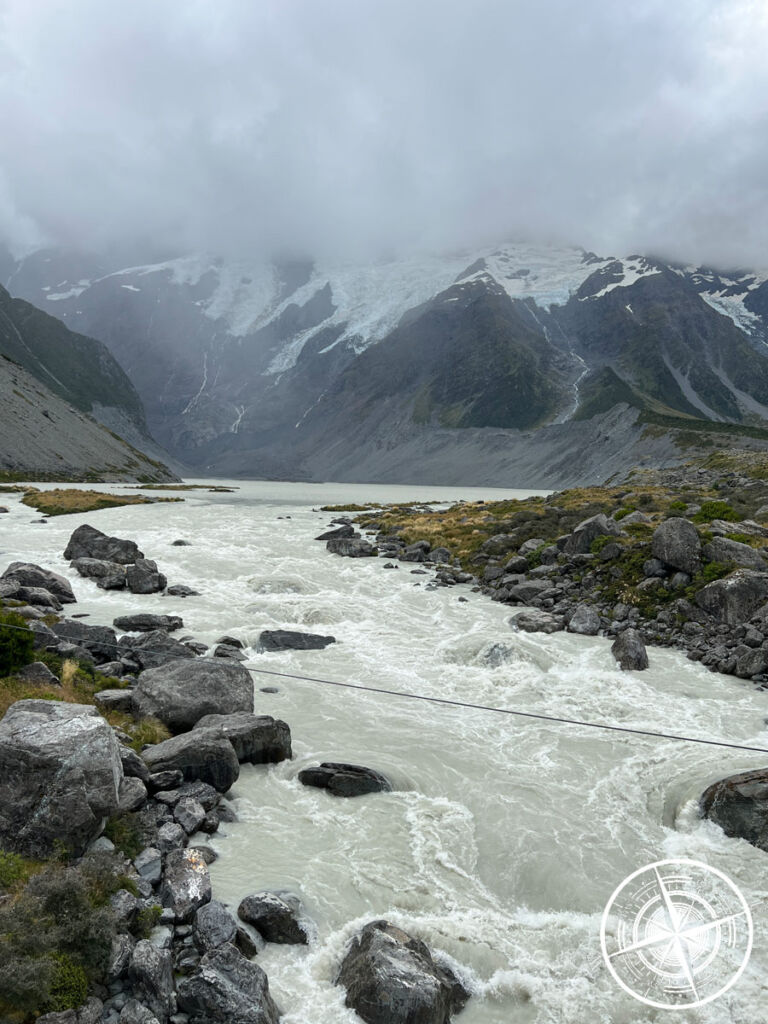 Vorbei am „Alpine Memorial“ folgt der „Mueller Lake Lookout“. Hier hat man direkte Sicht auf den „Mount Sefton“ (wenn die Wolken es zulassen) und kann sehen und hören wie die Gletscher schmelzen und abbrechen. Das Wasser dort ist quasi absolut frisches Gletscherwasser und fließt weiter bis in den „Lake Pukaki“. Es waren echt krasse Wassermassen und eine ordentliche Strömung.