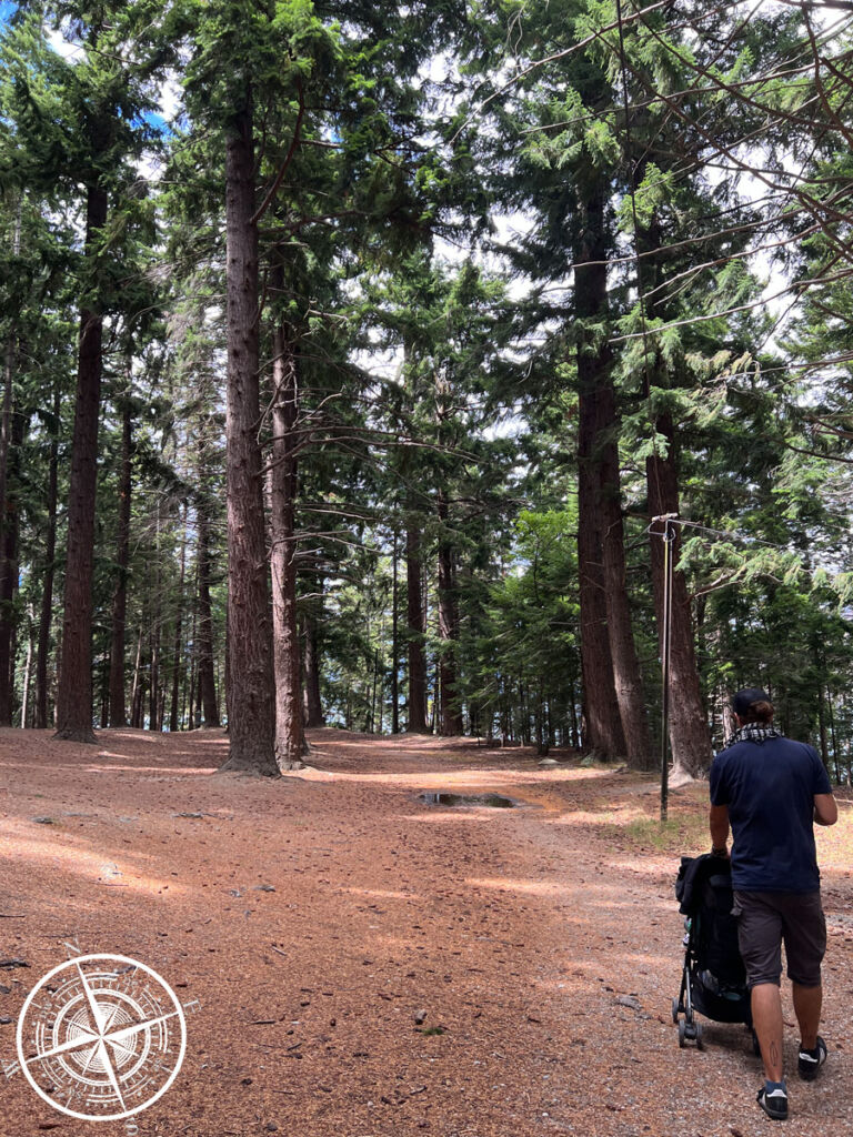 Wir hielten uns hier aber nicht allzu lange auf, da unser Großer bereits müde und bereit für seinen Mittagsschlaf war. Daher gingen wir einfach weiter über das Gelände (man kann hier übrigens auch Disc-Golf spielen) und unser Sohn schlief dann recht schnell ein. Es ist schon irgendwie verrückt hier. Wenn man hier durch den Wald geht, muss man zwar aufpassen, dass man nicht von einer Frisbee getroffen wird, aber sonst ist man total abgeschottet von dem „Trubel“ der Innenstadt und auch das Feeling durch die großen Bäume hier ist ganz anders. Aber schön anders. 😊 Zudem hat man auf der dieser Seite (also von der Innenstadt ein Mal über den Hügel) dann einen tollen Blick auf die andere Bucht und auf „Kelvin Heights“ (Stadtteil Queenstowns). Auch ziemlich schön und hier ist kaum jemand, falls man mal ein bisschen für sich sein möchte. 😉