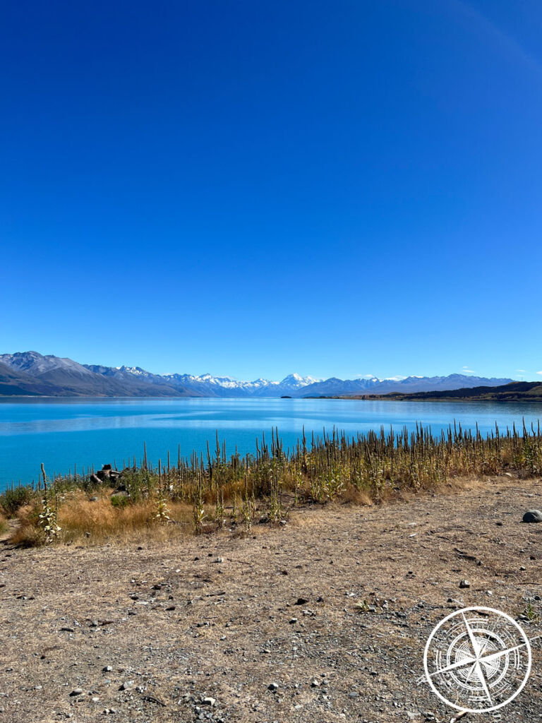 Bereits der „Lake Tekapo“ hat uns ja schon mit den Blautönen total umgehauen und so ging das immer weiter auf der Südinsel. Das Gletscherwasser oder wie ich hier schreibe „Neuseeland-blau“ ist einfach wunderschön. Das konnten wir dann auch bei einem Fotostopp am „Lake Pukaki“ bestaunen. Wow! Was für eine Aussicht! Bestes Wetter und dann die Sicht auf die schneebedeckten Berge am Horizont. Einfach WOW!