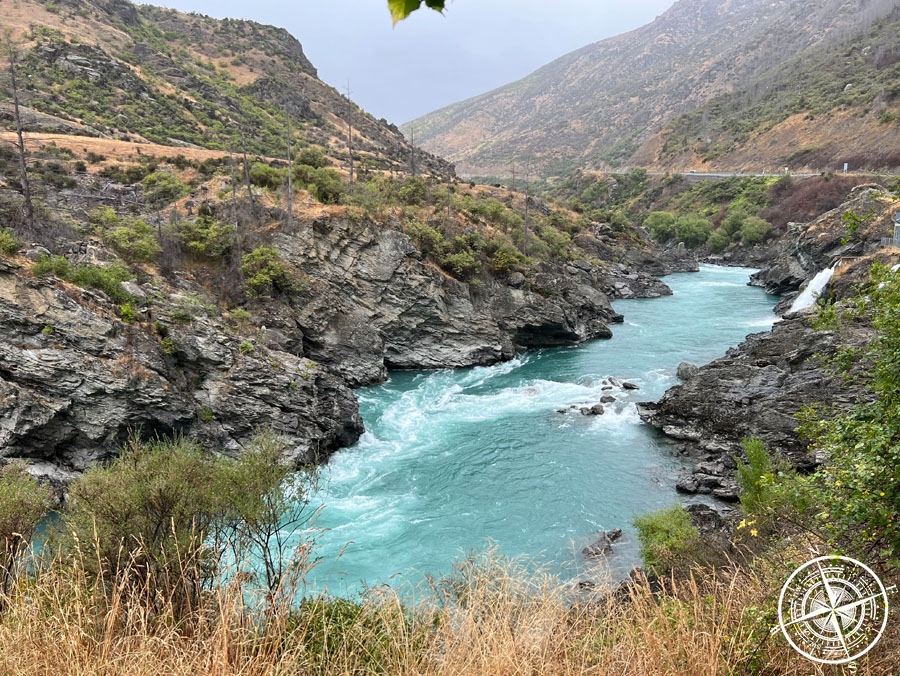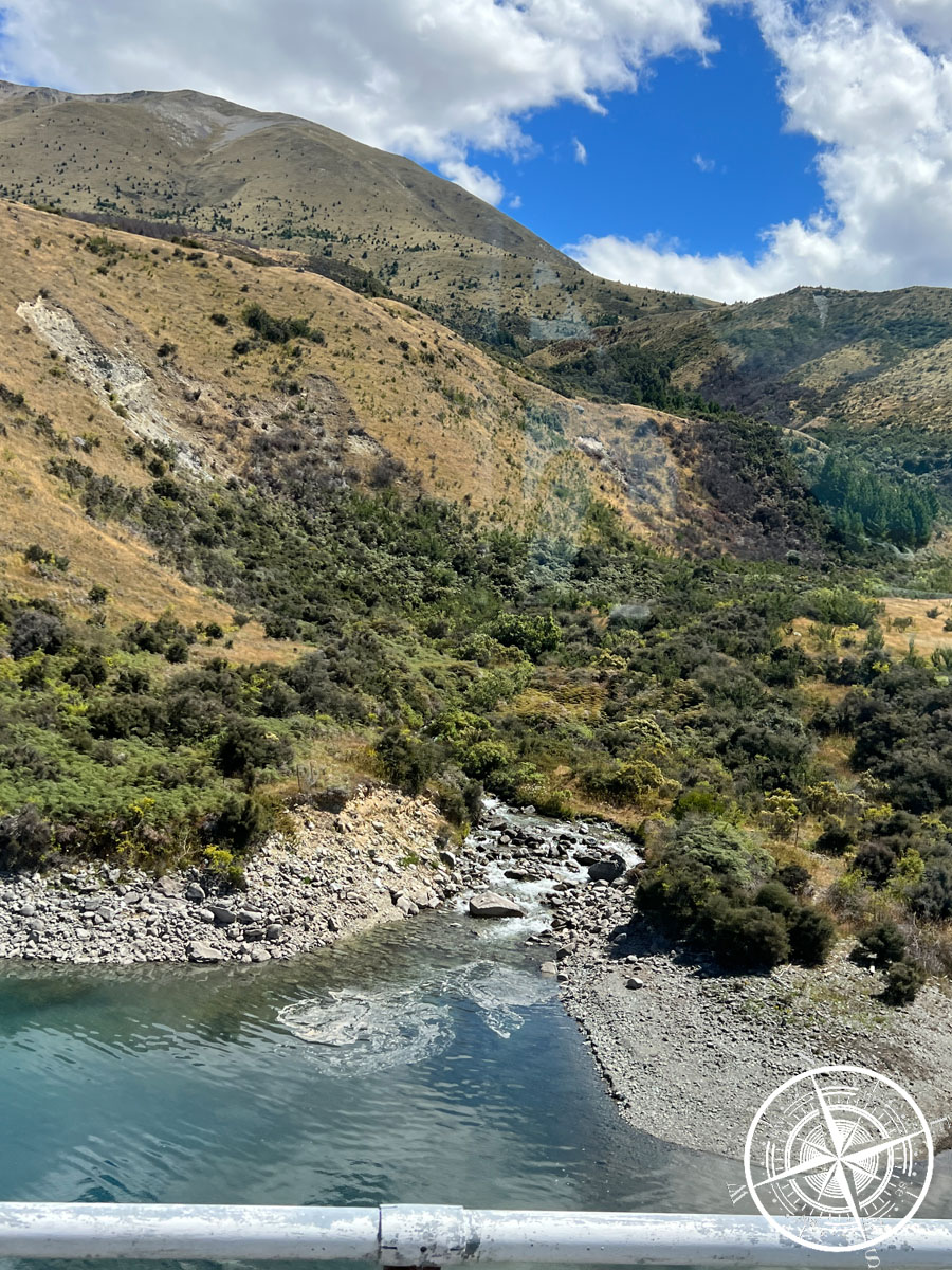 Nach „Cromwell“ folgte eine ziemlich schöne Strecke. Entlang des „Kawarau River“, der, wie sollte es auch anders sein, auch strahlend blau war, und auch mitten durch die Berge. Auch dieser Streckenabschnitt war ziemlich kurvenreich, aber einfach schön! 😊
