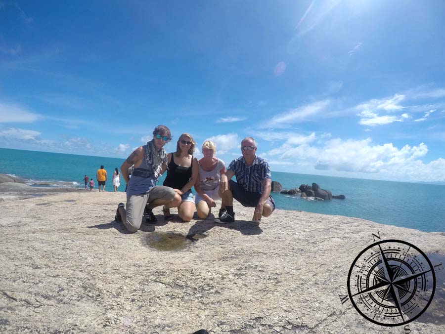 Wir packten unsere Sachen und schwangen uns auf die Roller. Unser erstes Ziel waren die „Hin Ta and Hin Yai Rocks“, denn hier waren wir verabredet. Wir hatten euch bereits schon aus Bangkok von Gabi und Henry erzählt, die wir zuerst im Flugzeug getroffen hatten. In Bangkok hatten wir Kontaktdaten ausgetauscht, da wir wussten, dass die beiden nach Koh Samui wollen. Ein Wiedesehen war quasi schon vorgeplant, aber da wir euch hier noch nicht bekannt geben wollten, dass wir auch noch auf die Insel wollen, haben wir nur geschrieben: „…wer weiß, vielleicht treffen sich die Wege ja noch einmal!“. Ein bisschen Spannung muss euch ja auch noch bleiben, nicht wahr!? 😉