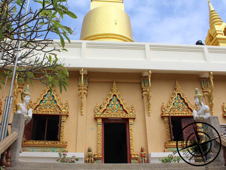 Auf der oberen Ebene ist man quasi auf dem Tempel und vor der großen goldenen Pagoda-Spitze. Sie ist wirklich sehr groß. Auf dem Plateau kann man rundherum gehen und hat einen schönen Ausblick auf die Umgebung, wie den Airport oder auch auf Chaweng.
