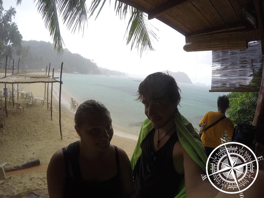 Als dann der Marimegmeg Beach in greifbarer Nähe war, machten wir uns auf in die letzten Meter und stellten uns dann bei der „SunBar“ unter. Der Name war gerade nicht Programm, aber immerhin gab es hier ein wasserfestes Dach und was zu trinken.