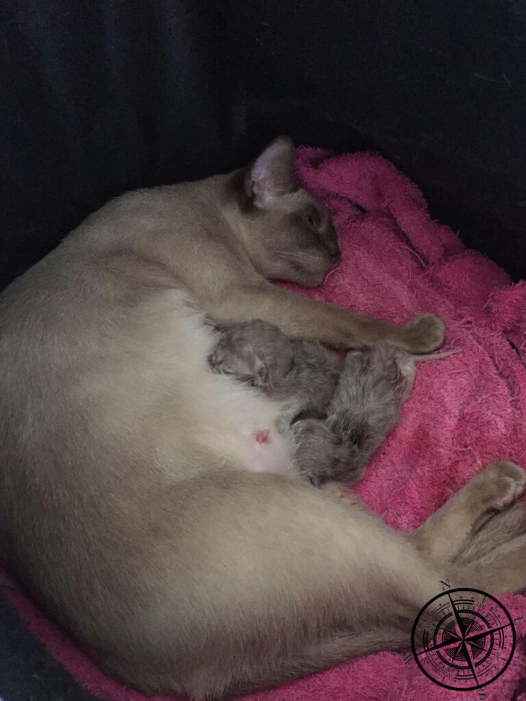 Es verging einige Zeit und Torben streichelte geduldig den Bauch von Lilly – die Geburtsvorbereitung. Doch dann kam endlich das erste Babykätzchen – ein Junge mit stolzem Gewicht von 105g (das schwerste Babykätzchen, was sie bisher hatten). Nach einer halben Stunde kam das Zweite – ein Mädchen, und wieder eine halbe Stunde später ein weiteres Mädchen. Das Dritte jedoch schien relativ klein und bewegte sich kaum und atmete nicht richtig. Kristy wusste zum Glück, wie man in so einer Situation reagieren muss. Wir kämpften somit, dass dieses kleine Kätzchen atmet und nach einiger Zeit begann es regelmäßig zu atmen.