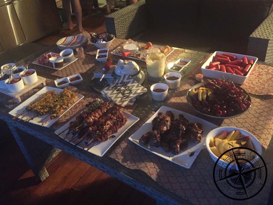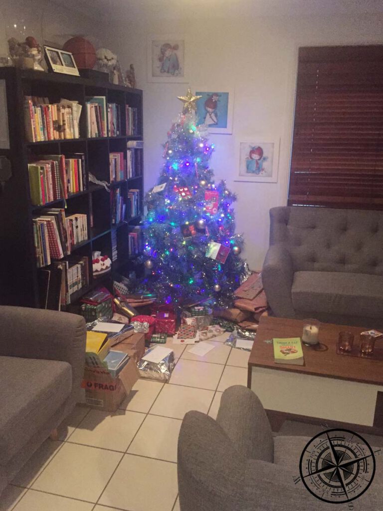 Danach sind wir dann zurück und es gab Abendessen auf der Terasse. Es war wunderbares Wetter! Der Tisch wurde mit verschiedenen „Snacks“, wie Frühlingsrollen, Chicken Nuggets, Käse, Dips, Cracker, Fleischspießen und anderen Kleinigkeiten gedeckt. Im Anschluss ging es dann ins Wohnzimmer. Hier stand ein kleiner, (Plastik-) Tannenbaum und darunter viele Geschenke. Nach einander wurden die Namen der Geschenke aufgerufen und jeder bekam was – auch wir! 🙂 Hier kam richtiges Weihnachtsgefühl auf!