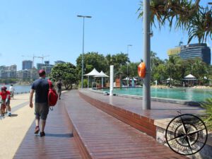 Diesmal aber etwas weniger Fußmarsch und mit dem „City Hopper“ vom „North Quay“ zu „South Bank 3“ – Eine Fährverbindung von der „Victoria Bridge“ rüber zur „Southbank“. Dort benötigte es nur ein paar Schritte, bis wir am „Strand“ ankamen. Wir haben unsere Sachen an einer kleinen Treppe, welche ins Wasser führt, abgelegt und uns auf die Stufen gesetzt. Herrlich! Nachdem wir schon einige Stunden bei sehr warmen Wetter unterwegs waren, kam hier die passende Abkühlung.