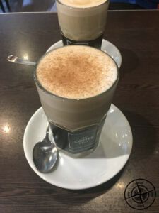 Die Frau dort war sehr nett und erklärte uns, was sie unter den verschiedenen Kaffeebezeichnungen verstehen. Ein Macchiato ist hier ein sehr strenger, starker Kaffee, quasi wie ein Espresso. Für Vivi ist der Latte besser, da es viel Milch enthält. Außerdem gab sie uns noch den Tipp immer einen „weak coffee“ (also einen schwachen Kaffee) zubestellen, d.h. sehr wenig Kaffee und viel (!) Milch – so wie Vivi ihn gerne mag! 🙂 Bestellung wurde aufgegeben und beide Getränke waren zu unserer Zufriedenheit!