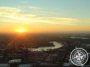 Irgendwann funktionierte dann der Aufzug wieder und die Menschenmengen verschwanden. Es blieben nur noch wir und zwei Mädels. Wir bestaunten den Sonnenuntergang, der von dort oben am Horizont bei den „Blue Mountains“ unterging. Wirklich wunderschön! 🙂