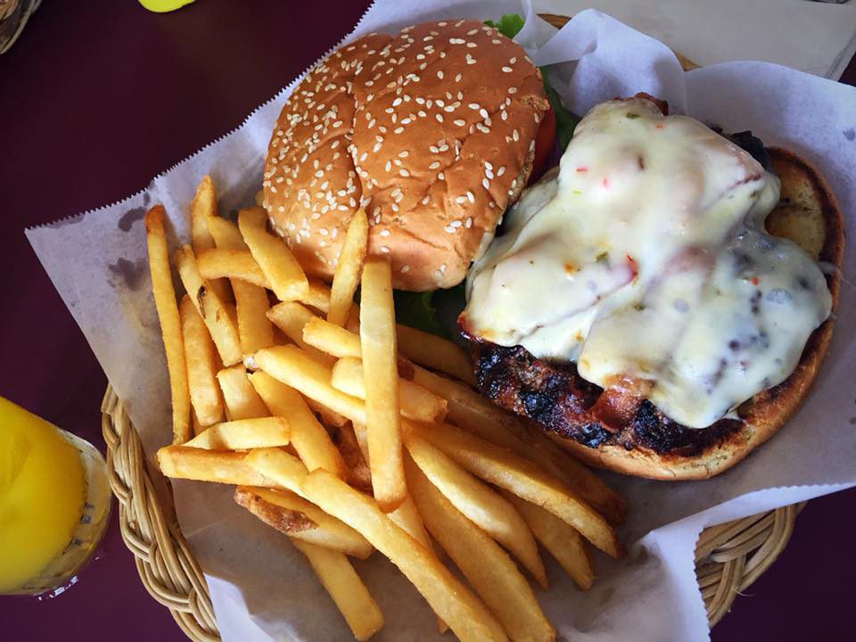 Wir entschieden uns dabei für das Hanalei Gourmet, da es entsprechend Burger im Angebot hatte und es im Vergleich mit den anderen Restaurants uns am meisten zusagte. Die Stadt ist überschaubar und das Restaurant liegt quasi direkt am Kuhio Highway, welche durch die Stadt führt. Zur Mittagszeit war es gut besucht, doch wir bekamen direkt einen Platz. Nach kurzem Überblick über die Speisekarte bestellten wir unser Essen und ich entschied mich für folgenden Burger:
