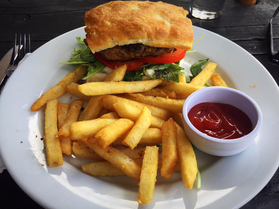 Der erste Burger lief wir dann in Waitomo auf den Teller. Bei unserem kurzen Stop in Waitomo hatten wir die Glühwürmchen Höhle besucht und damit ein echt geniales Erlebnis. Als wir danach auf unserer Bus zur Weiterreise warteten, bot sich „Curlys Bar“ perfekt für eine Stärkung an. Bei bestem Wetter und Sonnenschein auf der Außenterasse bestellten wir uns jeweils einen Burger. Für Vivi gab es sogar auch eine vegetarische Variante. Die Bar ist wohl auch abends gut besucht, obwohl in Waitomo selbst kaum was los ist.
